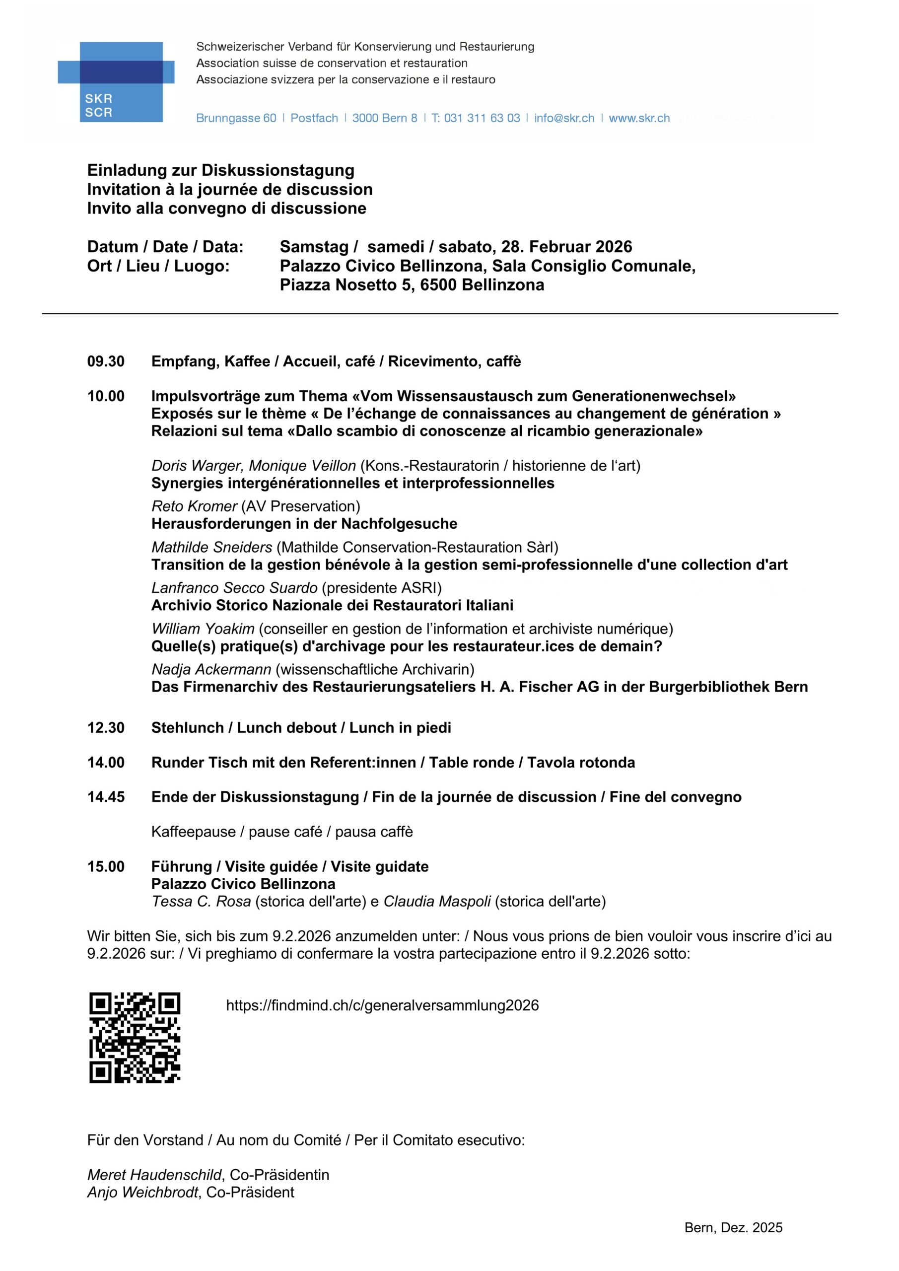 L’Associazione Giovanni Secco Suardo sarà ospite di Associazione Svizzera per la Conservazione e il Restauro – SKR per l’incontro di discussione dal titolo “Dallo scambio di conoscenze al ricambio generazionale”, una giornata dedicata al dialogo tra professionisti, studiosi e nuove generazioni nel campo della conservazione e del restauro.